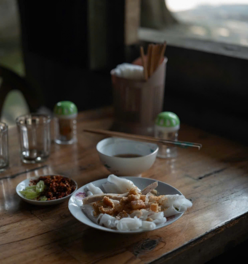 Tọa lạc tại số 32 Hoàng Quốc Việt - một con đường không quá sầm uất, quán bánh ướt O Lan không có bảng hiệu lớn, thậm chí trông khá giản dị với mái ngói bờ rô, bàn ghế nhựa cũ kỹ và sân vườn loang nắng. Nhưng đối với những khách du lịch đã chán với cái xô bồ, đông đúc và ồn ào của thành thị, muốn trải nghiệm một góc nhỏ yên bình của thôn quê dân dã thì đây chính là tọa độ lý tưởng. Một đĩa bánh ướt thập cẩm có chả, tóp mỡ giòn rụm, bên trên rắc tôm xay, hành phi, ăn kèm nước mắm chua ngọt có giá khoảng 15.000 đồng/dĩa - Ảnh: @hiko_hi_