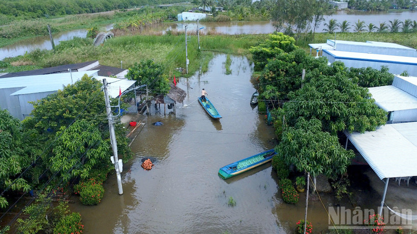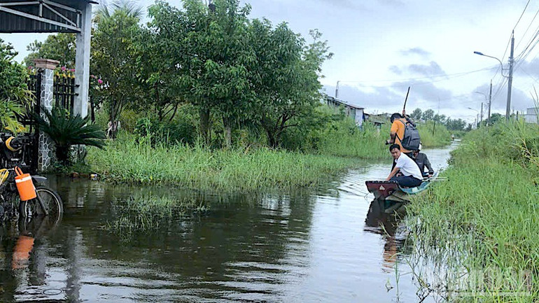 Con đường bê-tông độc vào khu tái định cư Kênh Tư giờ thành "biển nước", hoạt động đi lại chủ yếu bằng xuồng.