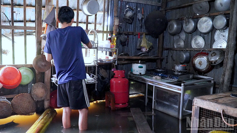 Nước ngập bủa vây thường xuyên nên người dân phải kê cao vật dụng thiết yếu, sinh hoạt trong cảnh ngập lụt.