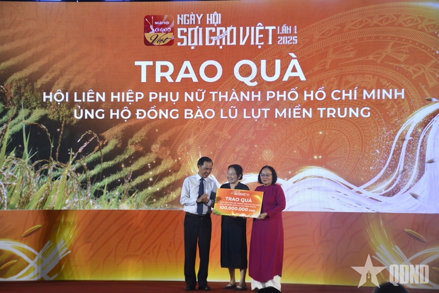Ban tổ chức ngày hội trao tặng 100 triệu đồng ủng hộ đồng bào lũ lụt miền Trung thông qua Hội Liên hiệp Phụ nữ TP Hồ Chí Minh.