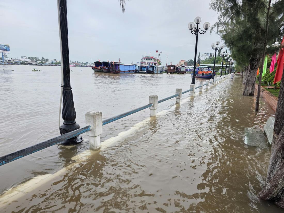 Khoảng hơn 19g ngày 23/10 triều cường lên cao, nước từ sông tràn vào gây ngập cục bộ tại một số nơi ở công viên Nguyễn Phương Danh (ấp Thị Tứ, xã Phong Điền) cùng một số tuyến đường trước công viên này.
