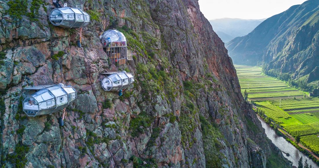 Ở thung lũng Sacred Valley - trái tim tinh thần của người Inca, Skylodge Adventure Suites mang đến trải nghiệm đầy thử thách khi các khoang ngủ bằng kính trong suốt được treo lơ lửng trên vách đá ở độ cao 400m. Khách phải leo dây qua vách đá hoặc trượt zip-line mới có thể tới phòng nghỉ. Bù lại, họ được ngắm cảnh chim ưng sải cánh và sông Urubamba cuộn chảy về phía Amazon.