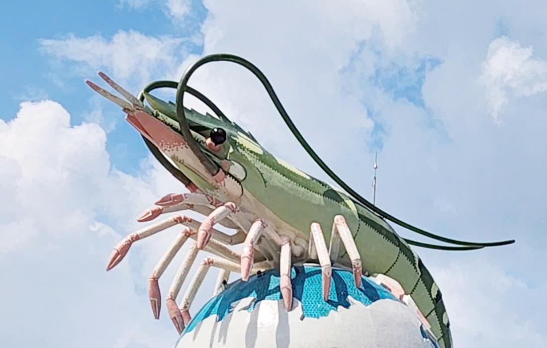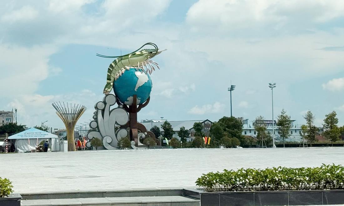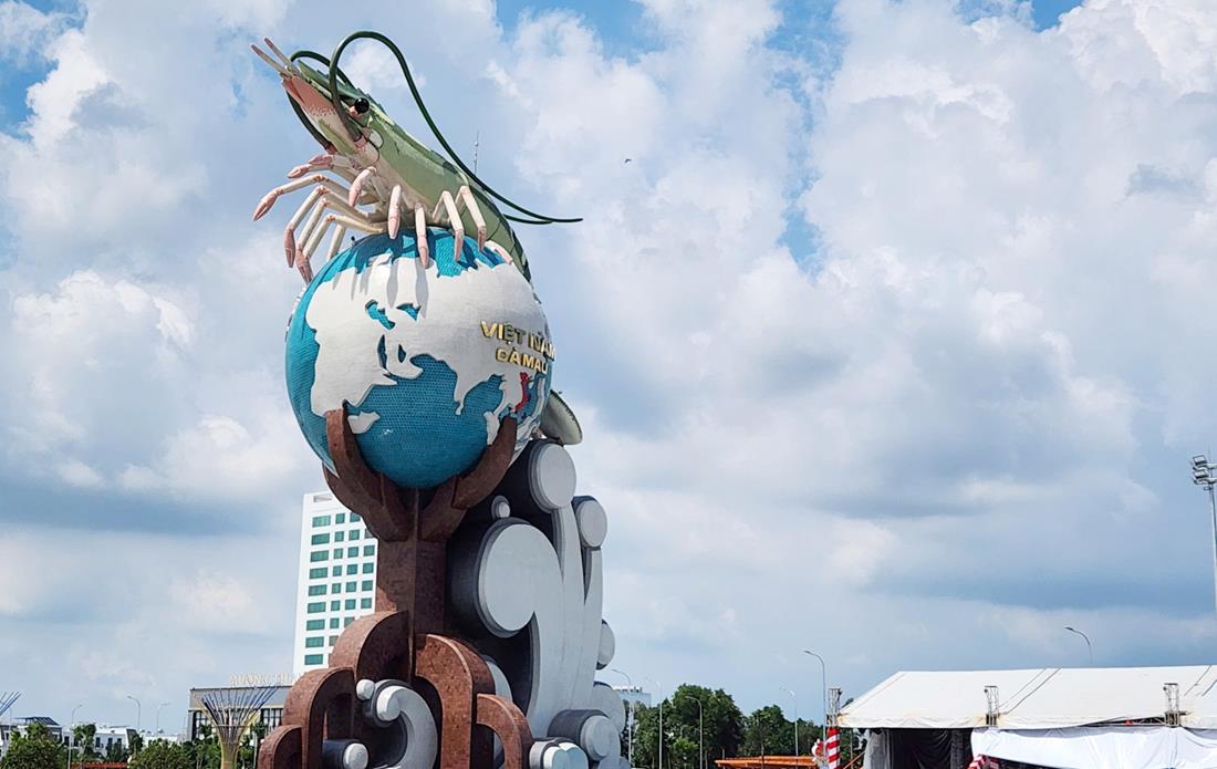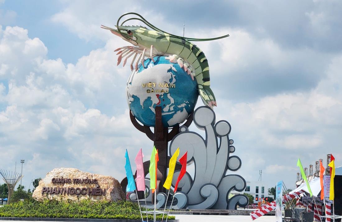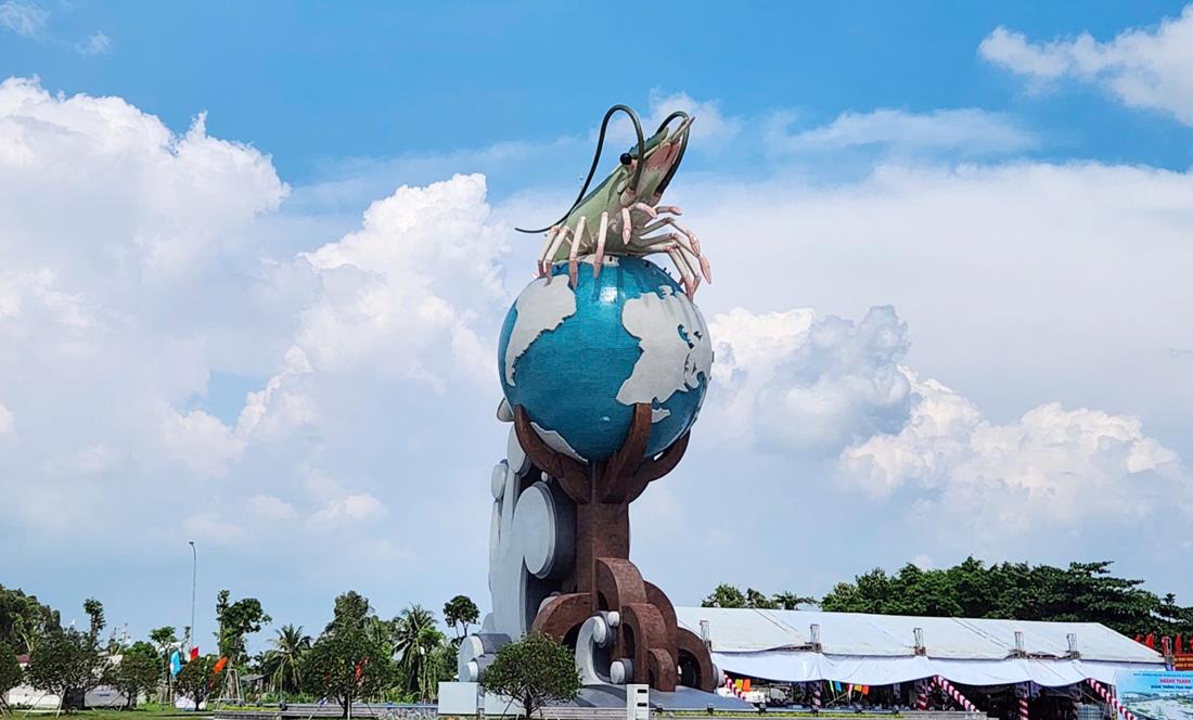 Cà Mau xứng tầm là “thủ phủ tôm” của cả nước nên tỉnh này đã xây dựng biểu tượng con tôm ôm lấy quả địa cầu với ý nghĩa đưa con tôm Cà Mau vươn ra thế giới.