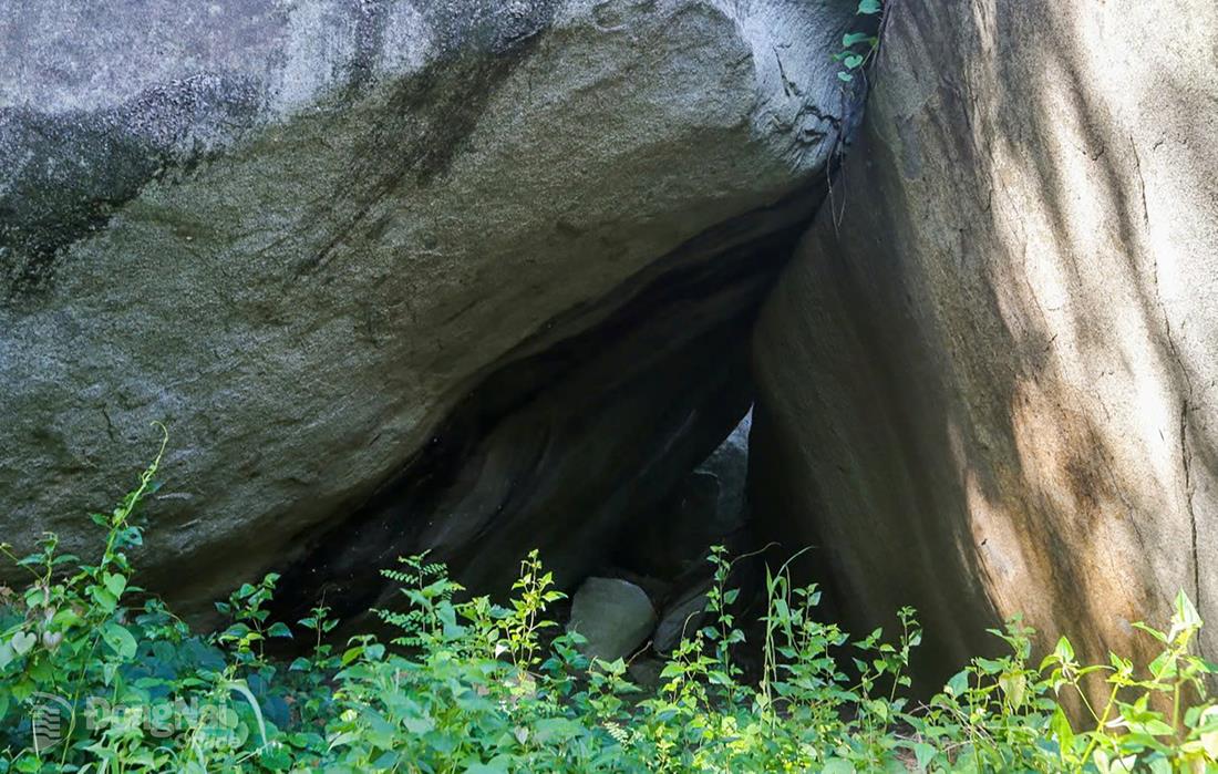 Những tảng đá to lớn chụm vào nhau lại thêm cây cối mọc um tùm tạo nên những hang động bí ẩn. Ảnh: Thủy Tiên.