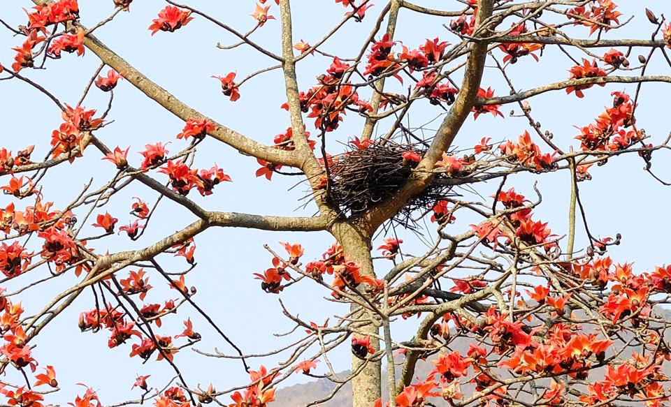 Một cây gạo bên con đường từ Mèo Vạc về Yên Minh (Hà Giang) được chim muông chọn làm nơi xây tổ ấm.