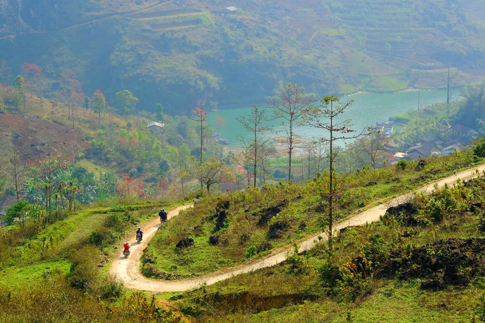 Tháng 3, trên các sườn đồi bên con đường quanh co, khúc khuỷu dẫn xuống dòng Nho Quế luôn bắt gặp những cây gạo đang nở hoa rực rỡ.