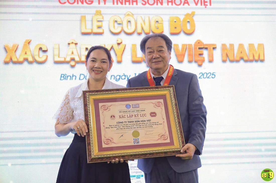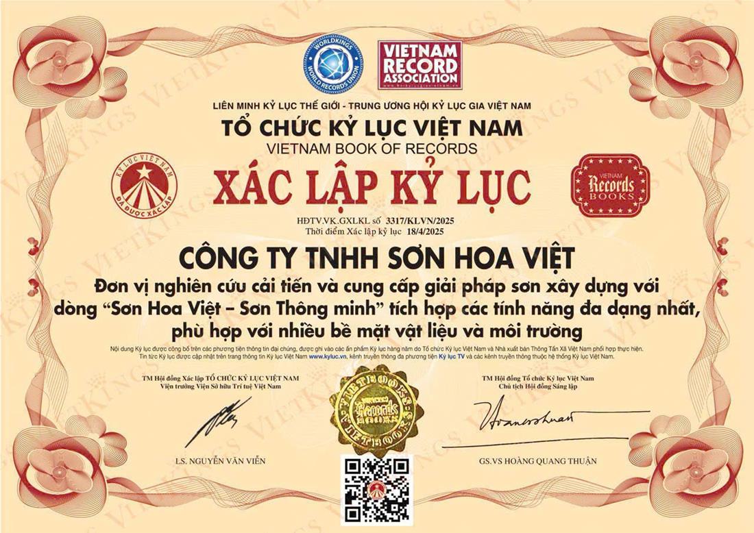 Ngày 15/6/2025, Tổ chức Kỷ lục Việt Nam công bố và trao chứng nhận xác lập kỷ lục Việt Nam cho Công ty TNHH Sơn Hoa Việt với dòng sản phẩm “Sơn thông minh - Dòng sơn xây dựng tích hợp nhiều tính năng nhất, phù hợp với nhiều bề mặt vật liệu và môi trường”. Sự kiện minh chứng cho sự sáng tạo, năng lực nghiên cứu, làm chủ công nghệ, đồng thời đánh dấu bước phát triển mạnh mẽ của Sơn Hoa Việt trong ngành vật liệu sơn phủ trong nước.