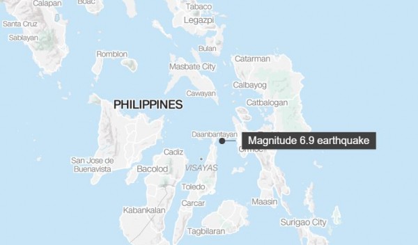 New York Times dẫn thông báo của Cơ quan Khảo sát Địa chất Mỹ (USGS) cho biết, một vụ động đất mạnh 6,9 độ richter đã xảy ra lúc 21h59 ngày 30/9 (20h59, giờ Hà Nội) với tâm chấn nằm cách bờ biển Calape của Philippines khoảng 10km về phía Đông Nam, khiến các hòn đảo thuộc tỉnh Cebu rung chuyển dữ dội.