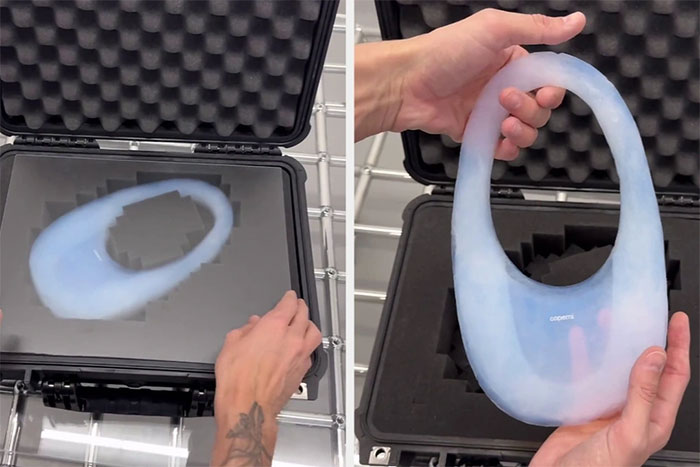 Chiếc túi xách đến từ thương hiệu thời trang Coperni Air Swipe được làm từ vật liệu aerogel xuất hiện lần đầu tại bộ sưu tập Thu Đông 2024, trong Tuần lễ Thời trang Paris, và đã nhanh chóng trở thành chủ đề bàn tán của thế giới thời trang nhờ các đặc tính phi thường của nó.
