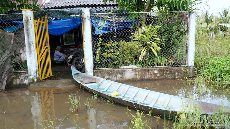 Con đường bê-tông độc vào khu tái định cư Kênh Tư giờ thành "biển nước", hoạt động đi lại chủ yếu bằng xuồng.