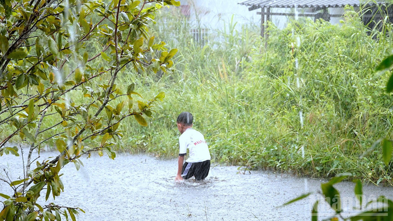 Trẻ nhỏ trong khu dân cư Kênh Tư tha hồ nô đùa, nghịch nước vào mùa triều cường, khi con đường trước nhà đã thành sông.