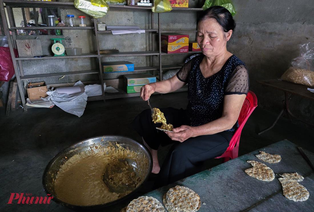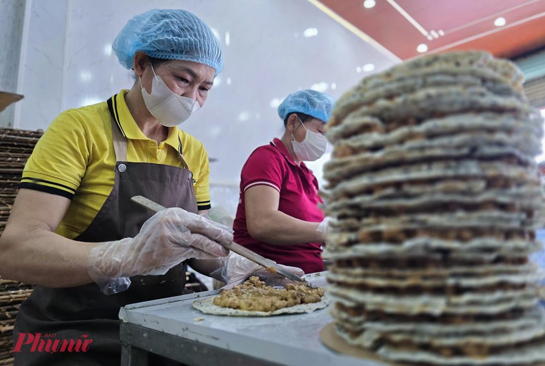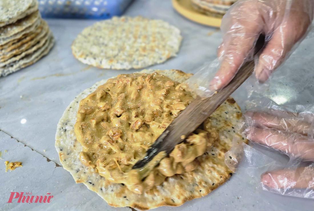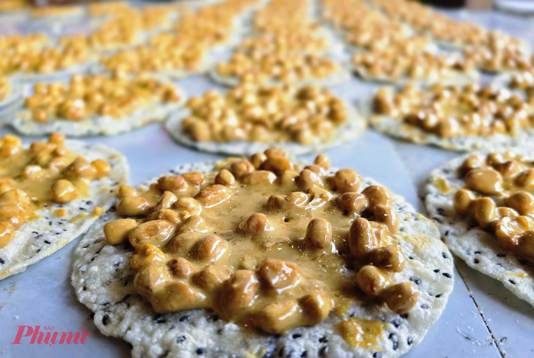Người thợ khéo léo múc hỗn hợp kẹo óng ả đặt lên bánh tráng cắt tròn, ép mỏng rồi ốp thêm một lớp bánh tráng bên trên.
