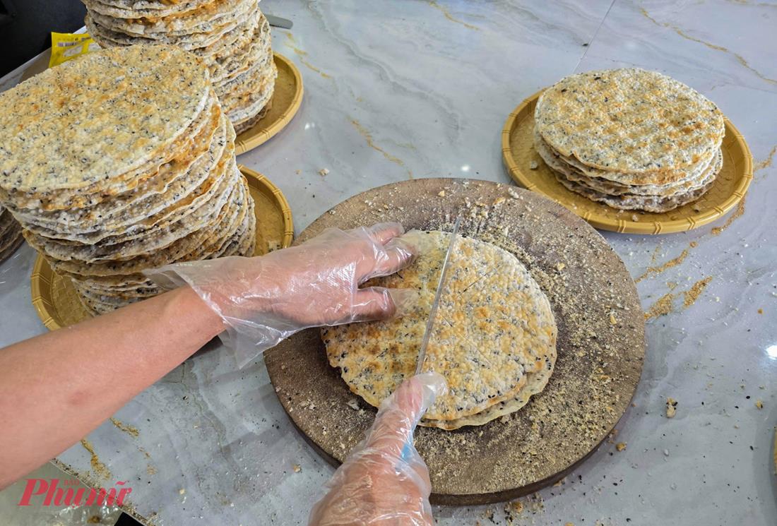 Khi kẹo vẫn còn nóng hổi, thợ làm bánh nhanh chóng dùng dao chia thành 8 phần bằng nhau. Những chiếc kẹo thành phẩm được xếp chồng gọn gàng, gói lót cẩn thận để khi thưởng thức chỉ cần bóc tay, kẹo vẫn giòn, thơm và giữ trọn vị.