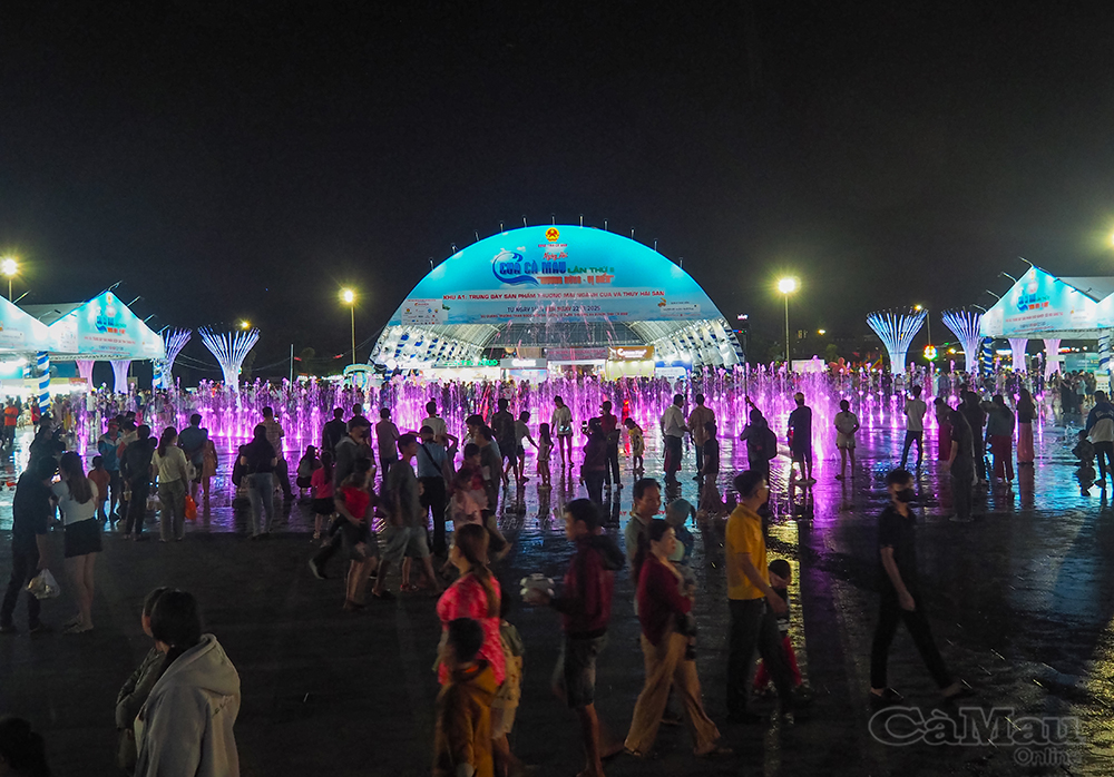 Đông bảo người dân và du khách đến vui chơi, chiêm ngưỡng nhạc nước về đêm trong ngày hội cua.