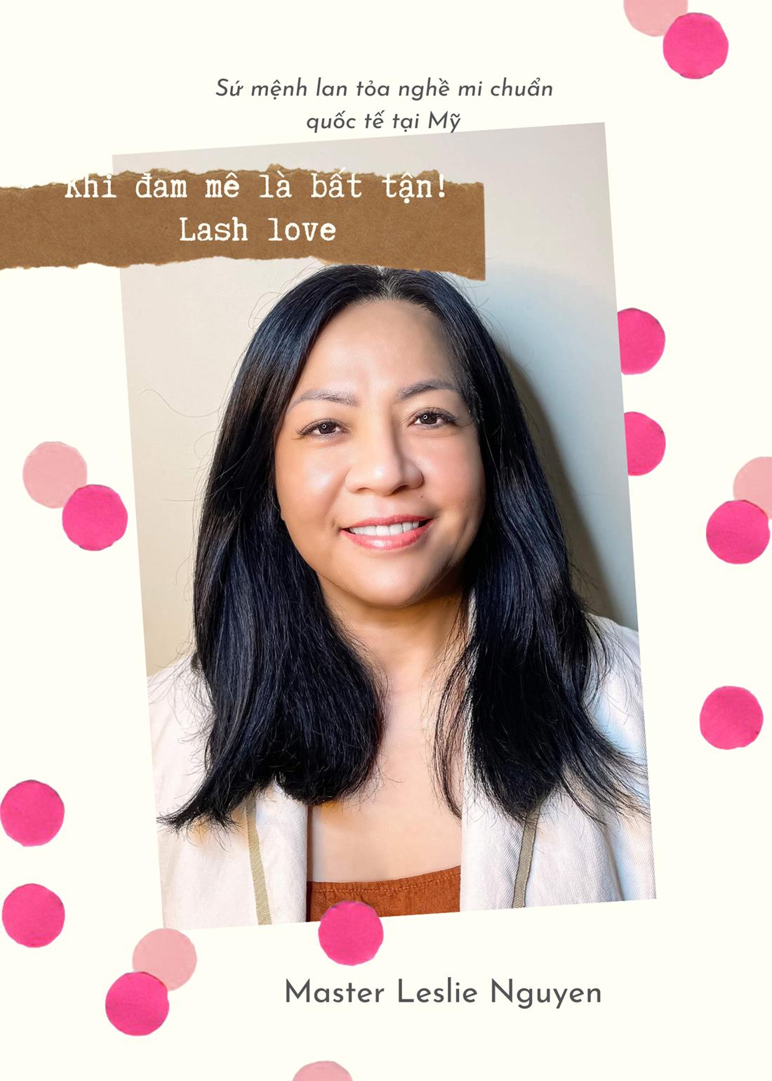 Biết đến nghề mi gần 10 năm, Master Leslie bén duyên khi học cùng lớp nối mi của thầy Daniel Phu năm 2014 nhưng vì quá bận rộn với công việc khác, cô phải tạm ngừng một thời gian không làm nghề.