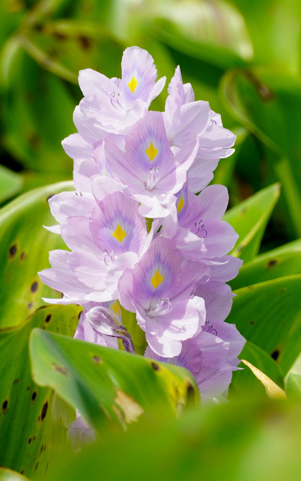 Hoa có màu tím nhạt, điểm vàng ở giữa, cánh mỏng manh. Hoa lục bình không có hương thơm, cánh rất mỏng, thường nở nhanh rồi chóng tàn.