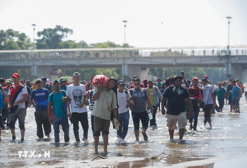 Người di cư Trung Mỹ vượt sông Suchiate từ Guatemala để tới Mexico, trong hành trình đến Mỹ. Ảnh: TTXVN