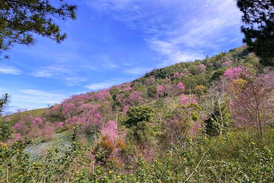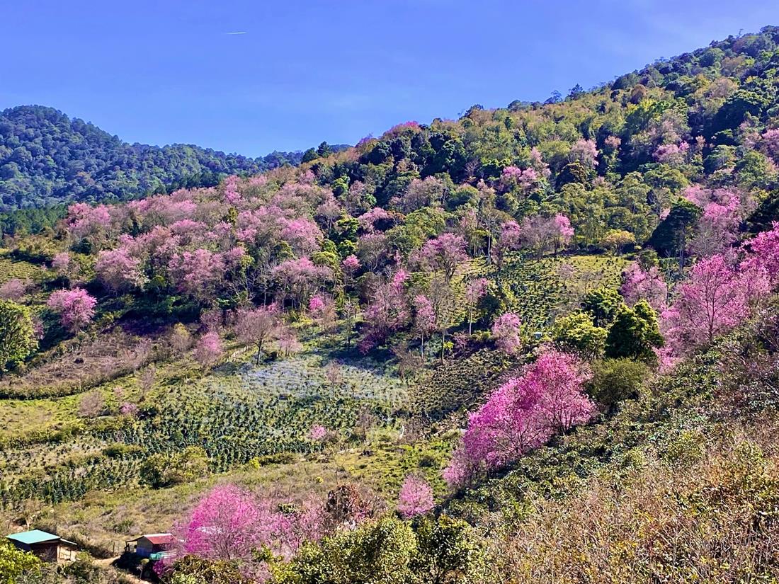 Nhưng cũng rất xứng đáng để vượt qua con đường trong mùa anh đào nở. Chỉ cần qua khỏi gần điểm đến, cảnh vật hoàn toàn khác. Cả một quãng rừng mênh mông trên sườn núi như bừng sáng với anh đào hồng thắm tuôn nở. Theo con đường rừng đi sâu vào bên trong, cảnh vật thanh bình, tiếng chim hót, hoa mai anh đào mọc chen với cây rừng nở khắp nơi, phong cảnh núi rừng hùng vĩ. Sâu phía dưới kia là thung lũng với hồ Đan Kia nước xanh mùa này cùng những mảng trắng nhà kính trải dài ven hồ.
