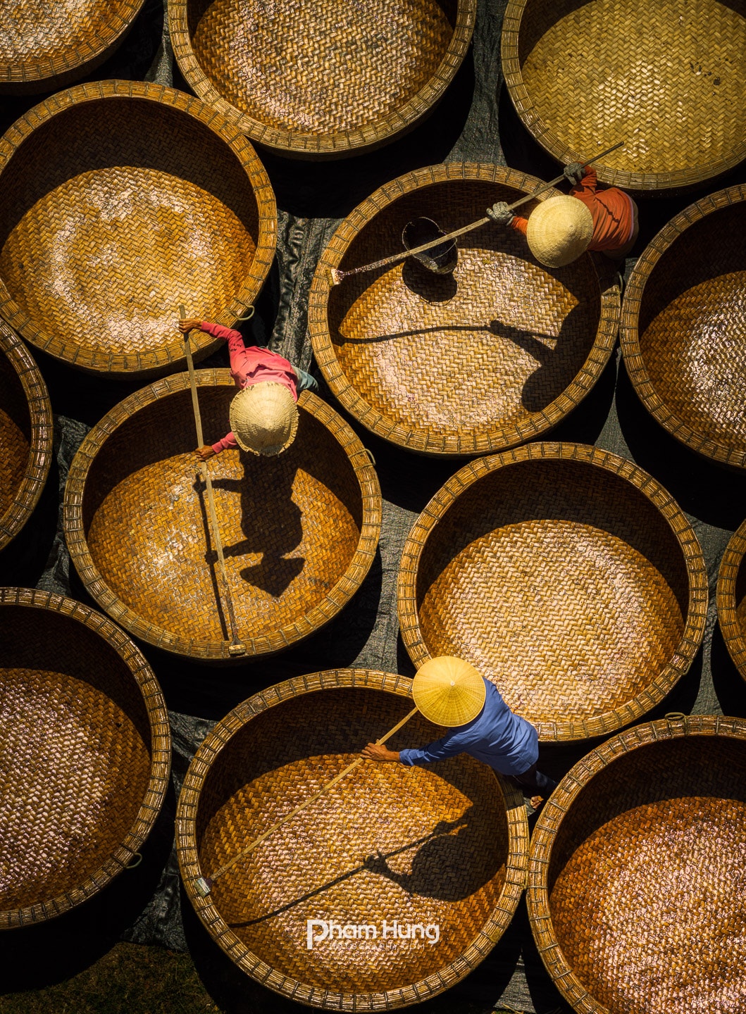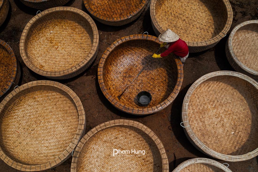Khi thúng đã hoàn thiện, người thợ sẽ dùng phân bò tươi hòa lẫn cùng nước trát đều lên hai mặt. Cách làm này nhằm bịt kín các kẽ hở của nan tre. Hai lớp phân bò khô lại tiếp tục quét hai lớp nhựa dầu rái là hoàn thành. Ảnh: Nguyễn Trình.