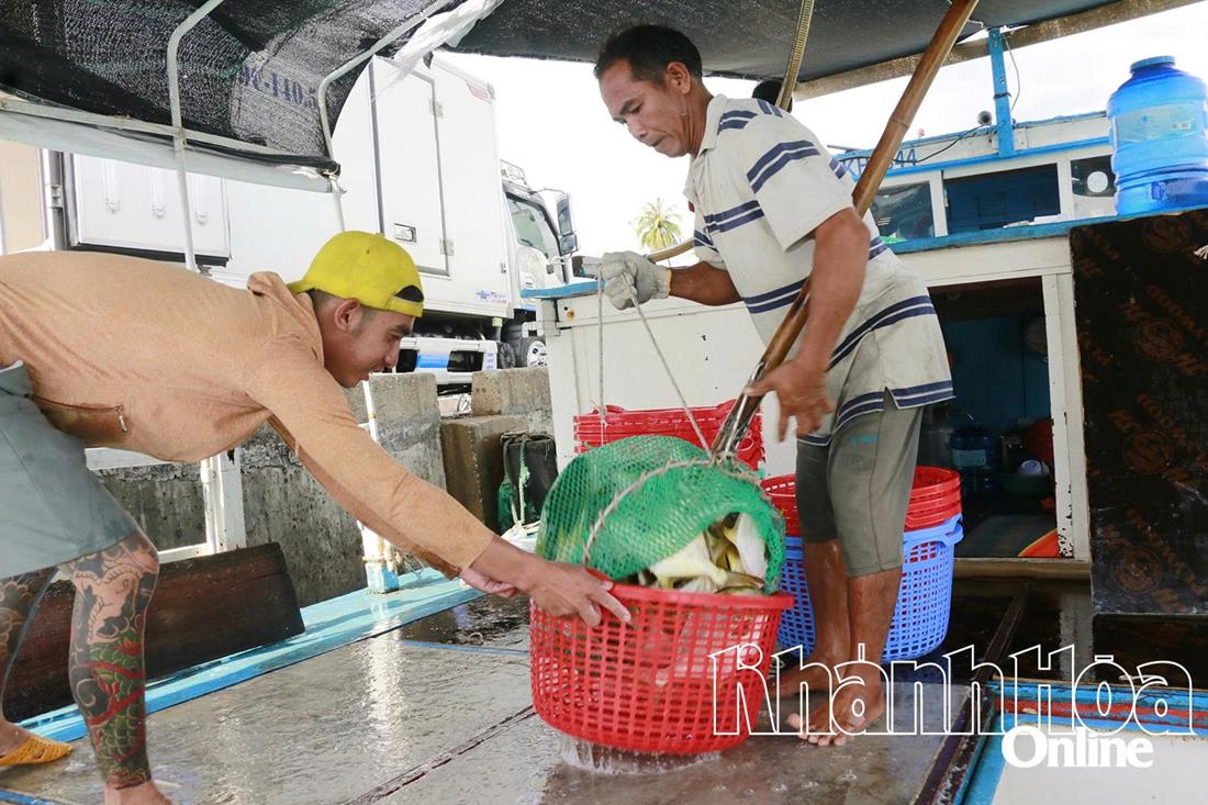 Có mặt tại khu vực vịnh Vân Phong vào chiều 4/11, hàng chục hộ dân thôn Đầm Môn (xã Đại Lãnh) tất bật huy động phương tiện, nhân lực để thu hoạch tôm và cá. Các mặt hàng này ngay sau khi thu hoạch được đưa vào bờ bán cho thương lái đã chờ sẵn. Không khí thu mua tôm, cá tại khu vực cảng cá Đầm Môn tấp nập, rộn ràng.