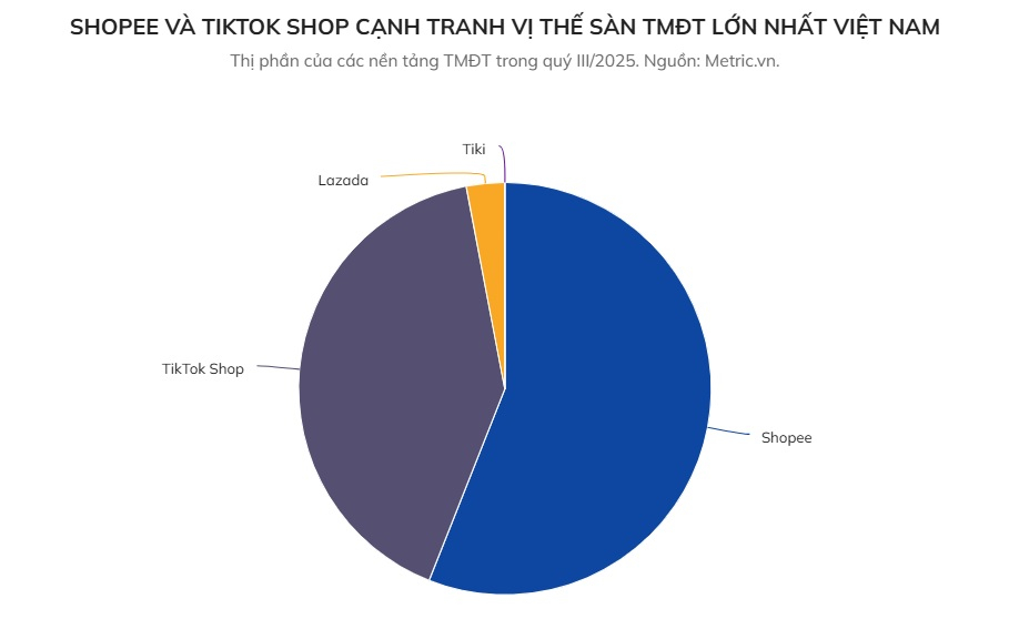 Trong quý III, Shopee tiếp tục dẫn đầu thị trường với 56% thị phần dù chỉ ghi nhận mức tăng trưởng doanh số nhẹ 4% so với cùng kỳ năm 2024, phản ánh dấu hiệu chững lại trong bối cảnh cạnh tranh gia tăng.