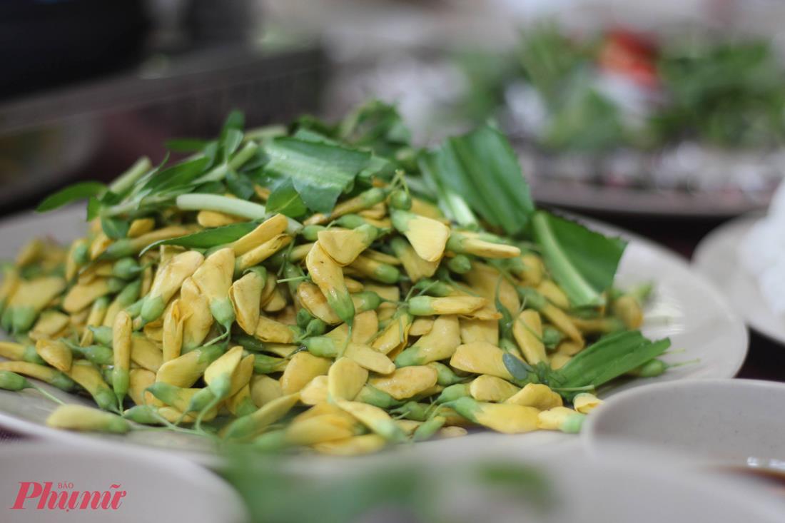 Ngoài cá linh-bông điên điển, mâm cơm mùa nước nổi cũng góp mặt các loại rau đồng quê như bông súng, rau nhút, ngó sen giòn ngọt... - Ảnh: Huỳnh Hằng.