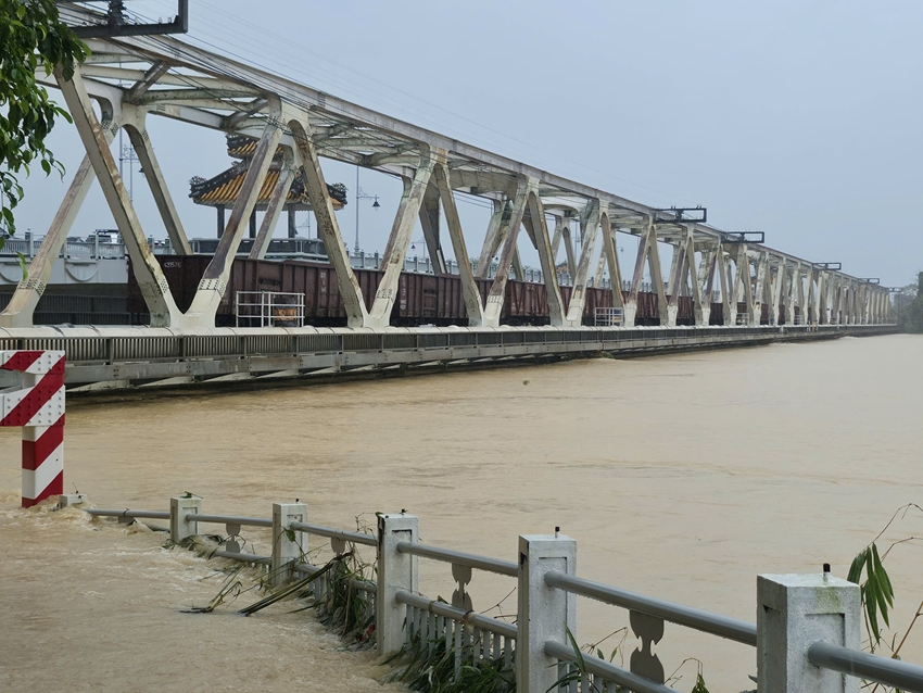 Ngành đường sắt điều động 19 toa xe chở đá lên trên cầu Bạch Hổ nhằm tăng tải trọng, tránh nguy cơ bị cuốn trôi.