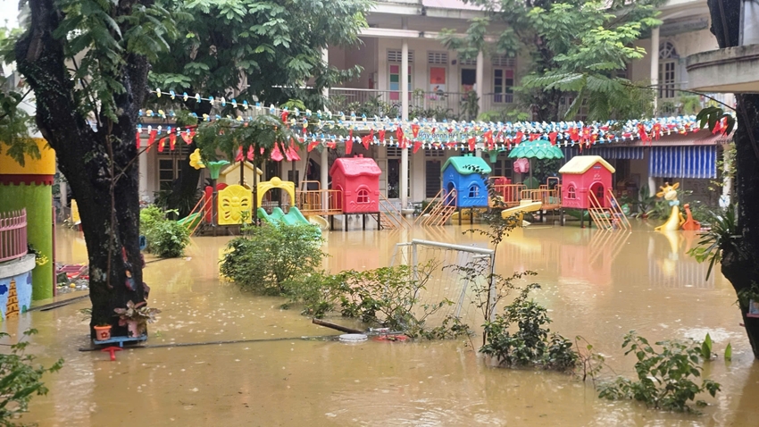 Trường mầm non Tây Lộc (phường Phú Xuân) vẫn ngập sâu khoảng 1,2m.