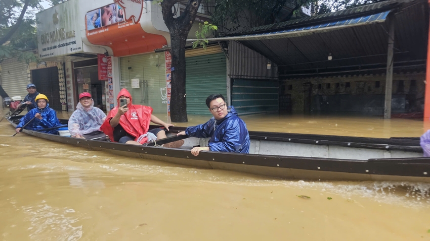 Di chuyển bằng xuồng máy tại khu vực đường Nguyễn Trãi (phường Phú Xuân) do ngập sâu.