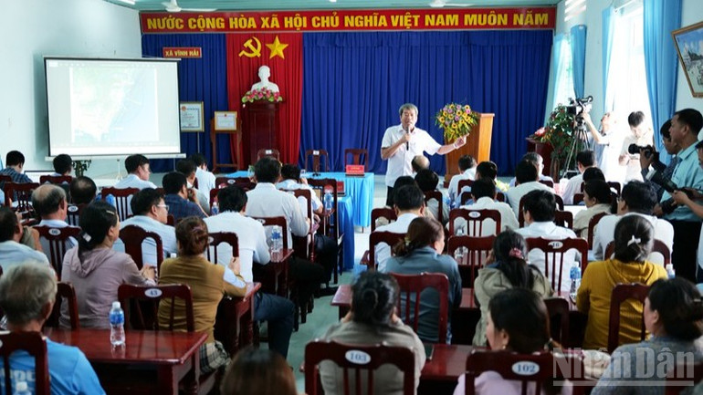 Ủy ban nhân dân xã Vĩnh Hải (Khánh Hòa) tổ chức buổi họp dân để giới thiệu và lấy ý kiến nhân dân về việc bố trí khu tái định cư mới khi xây dựng Nhà máy điện hạt nhân Ninh Thuận 2.
