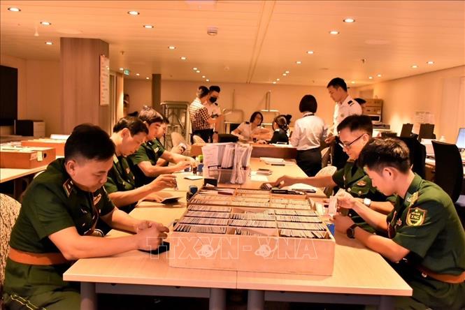 Đội Thủ tục, Ban Chỉ huy Biên phòng Cửa khẩu Cảng Bà Rịa - Vũng Tàu kiểm soát và đóng dấu nhập cảnh hộ chiếu cho du khách trên tàu Spectrum of the Seas trước khi tàu cập cảng. Ảnh: TTXVN.