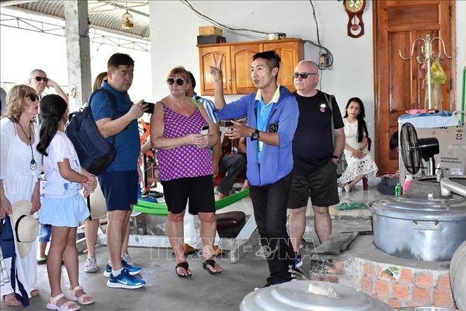 Các du khách tàu Spectrum of the Seas hào hứng, thích thú khi tham quan nghề nấu rượu truyền thống tại TP Bà Rịa, tỉnh Bà Rịa - Vũng Tàu. Ảnh: TTXVN.