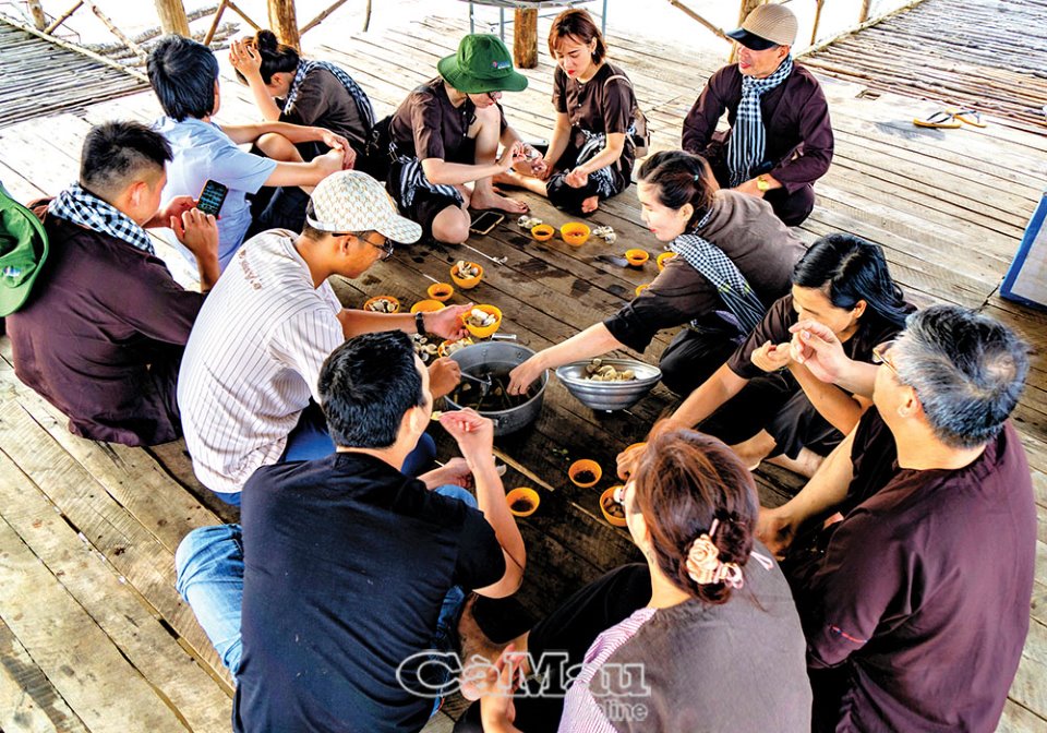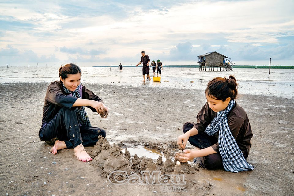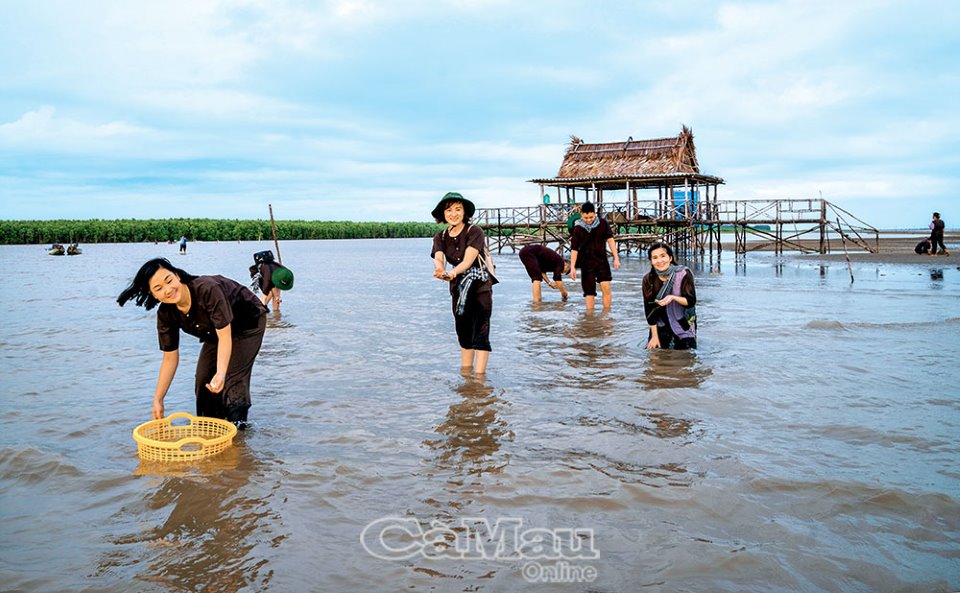 Các nhà làm du lịch Mũi Cà Mau đang khai thác rất hiệu quả tour du lịch biển bãi Khai Long - Ðất Mũi. (Trong ảnh: Ðoàn của Bamboo Airways trải nghiệm bắt nghêu bãi Khai Long).