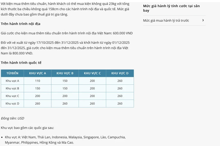 Trên website của Vietnam Airlines, mức giá hành lý tính cước tại sân bay mua thêm tiêu chuẩn trên hành trình nội địa và quốc tế - Ảnh chụp màn hình.
