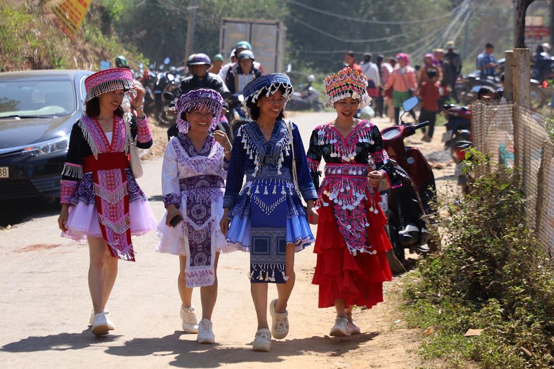Phụ nữ Mông trong trang phục truyền thống đến chợ phiên để gặp gỡ, vui chơi