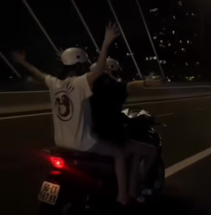 Khi đang chạy trên cầu Ba Son (phường Sài Gòn, TP.HCM), M.A. đã buông cả hai tay, hò hét theo hai người đi cùng. Người ngồi giữa còn đứng lên xe, tiềm ẩn nguy cơ tai nạn.