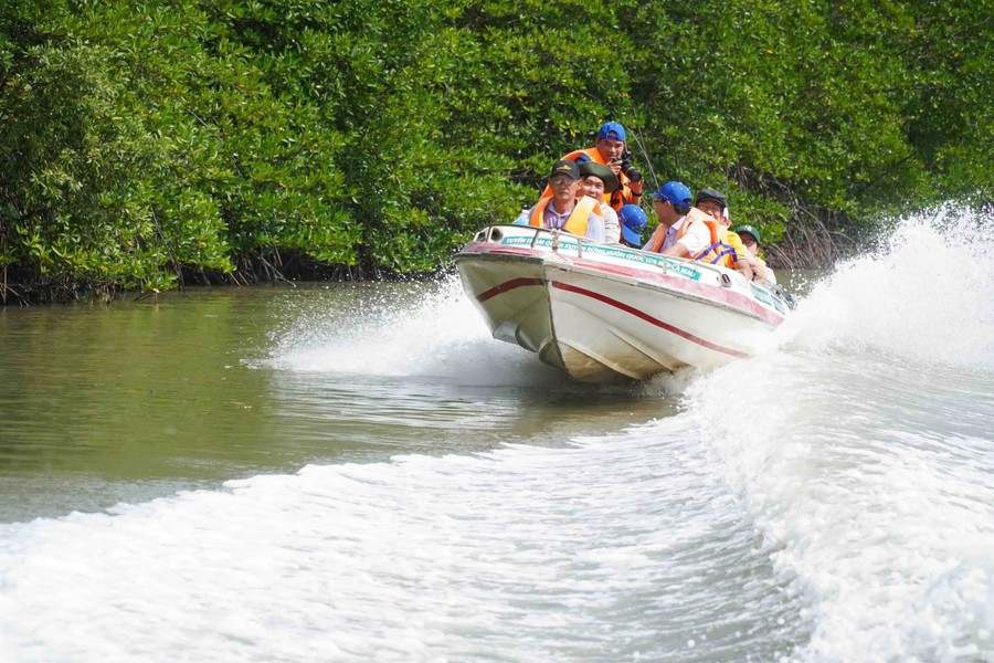 Du khách tham quan Vườn Quốc gia Mũi Cà Mau bằng canô.